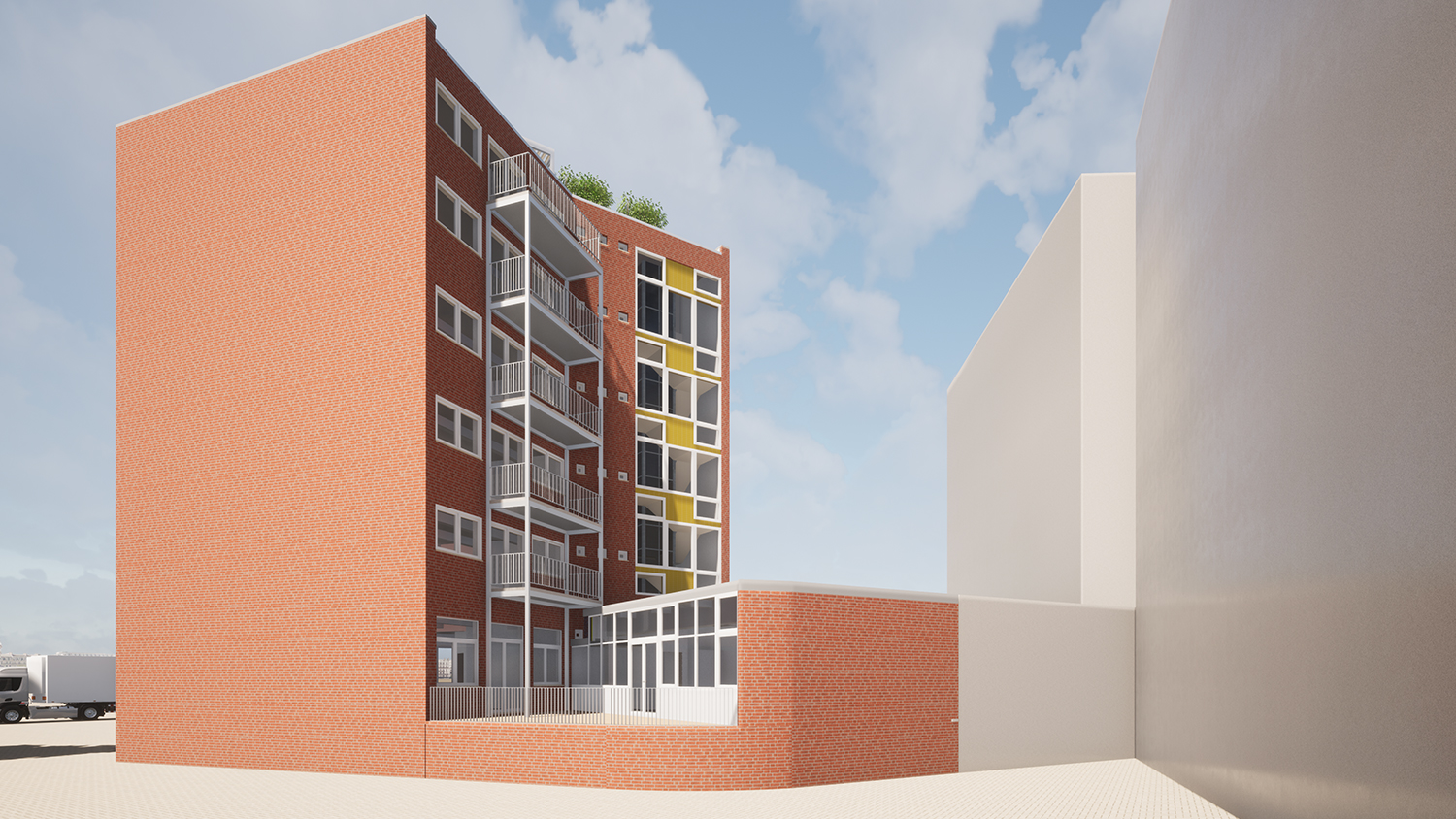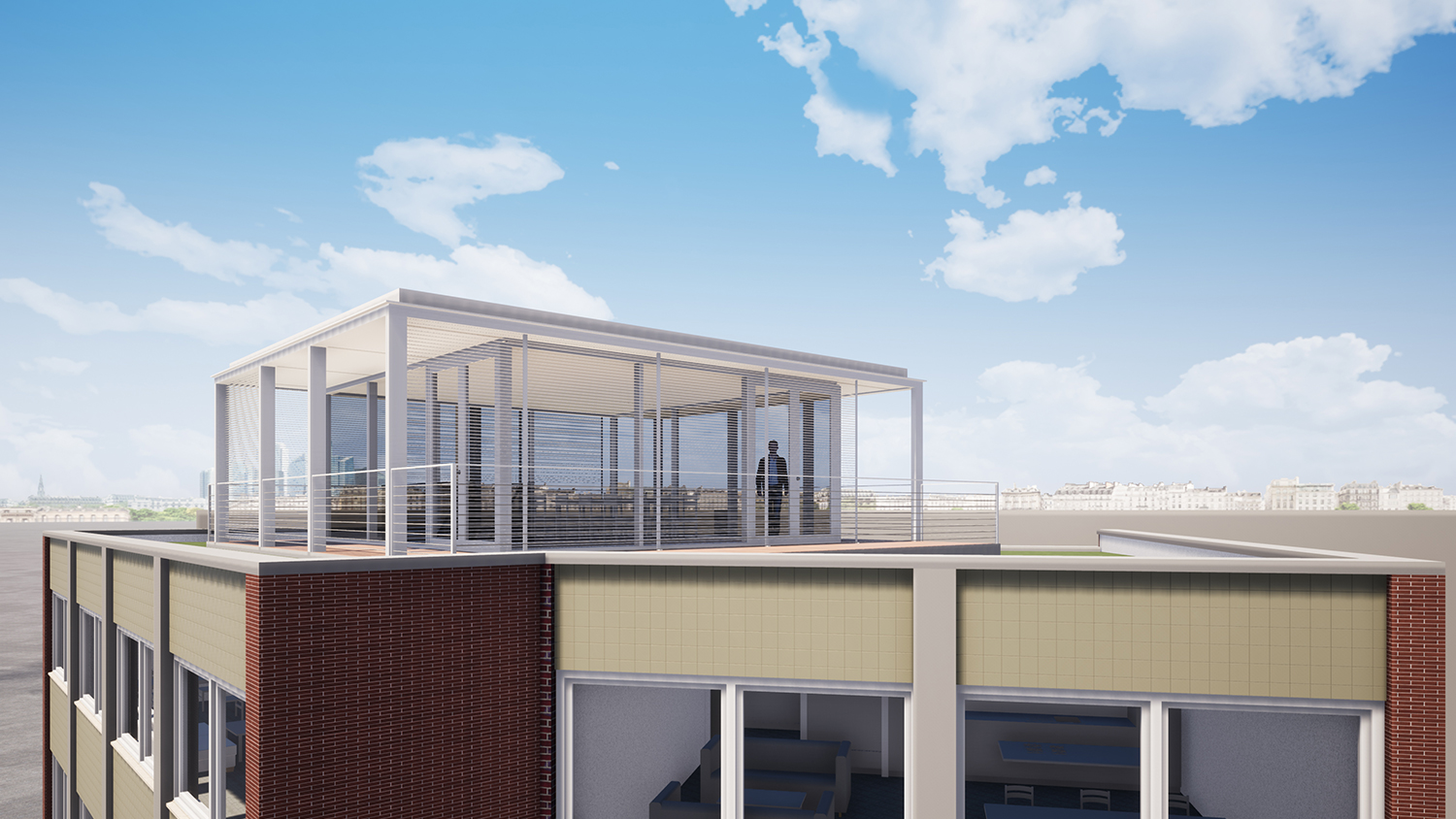 Die loftartigen Büroflächen werden den künftigen Nutzern als veredelter Rohbau zum weiteren Ausbau zur Verfügung gestellt. Der in der Entwurfsphase noch vorgesehene Dachaufbau und die vorgestellten Balkone an der Gebäuderückseite wurden nicht realisiert.