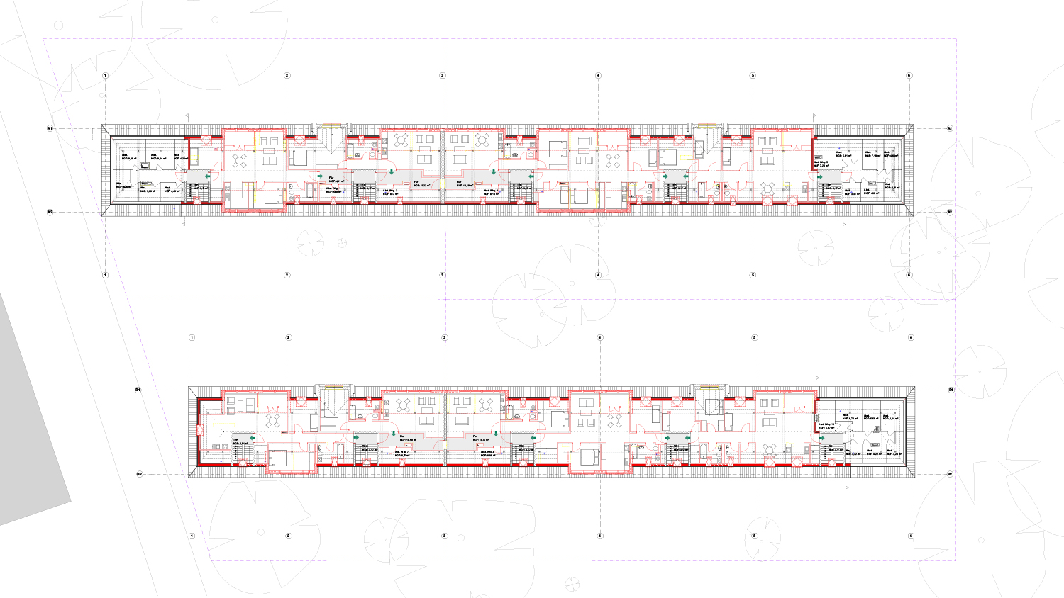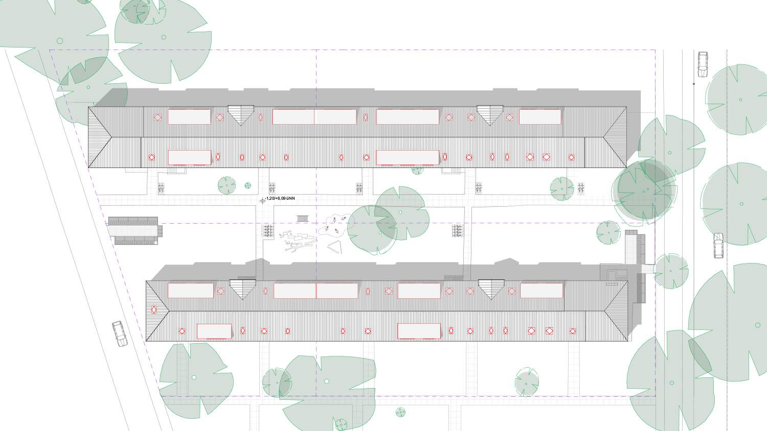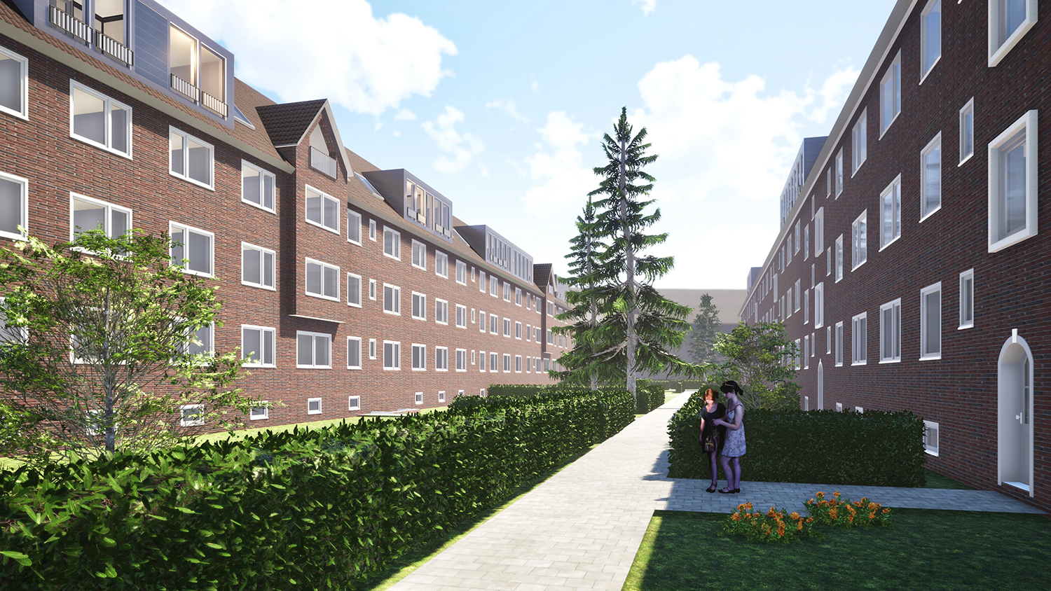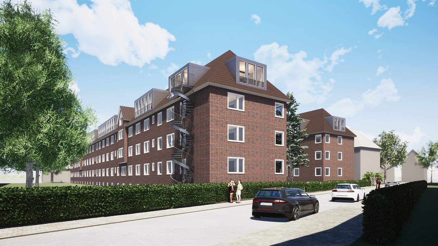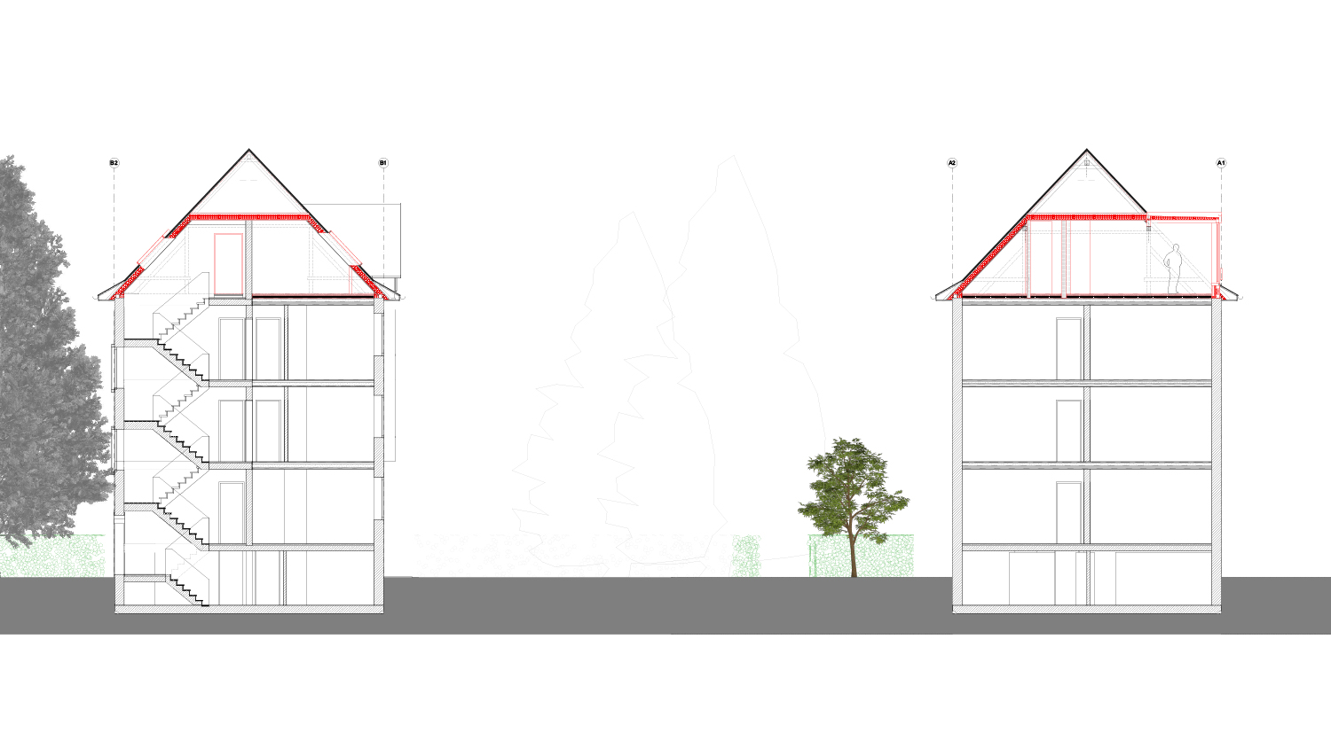 Der Entwurf verfolgt das Ziel, den historischen Gebäudebestand mit möglichst geringen Eingriffen zu erweitern. Die vorhandene Klinkerarchitektur bleibt in ihrer äußeren Wirkung erhalten. Sichtbar wird der Dachausbau vor allem durch neu eingefügte Gauben, die den Wohnungen großzügige Belichtungsflächen und nutzbare Raumhöhen eröffnen. Ergänzt werden diese durch stählernde Fluchttreppen an den Stirnseiten, die in die Gesamtgestaltung zurückhaltend eingebunden sind.